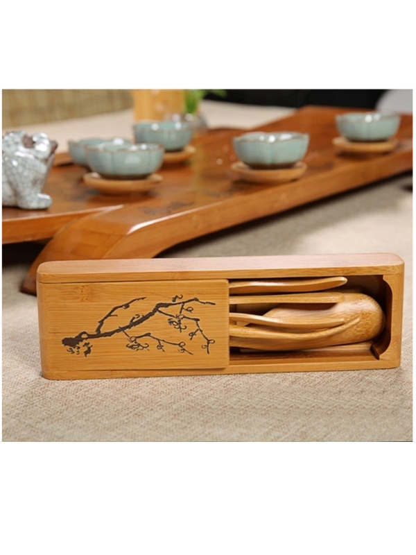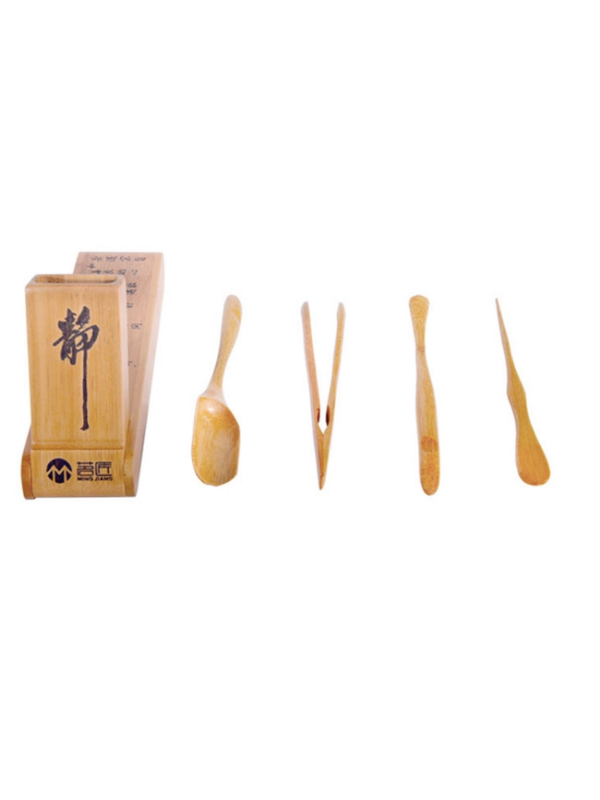 Bộ dụng cụ pha trà Hòa Kính Thanh Tịnh làm bằng chất liệu trúc ép, bao gồm các chi tiết sau: